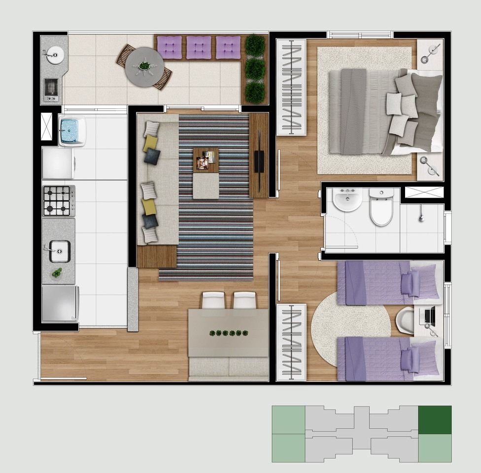 - Apartamentos 2 Dorm.: 49.20m², 50.26m² e 51.43m²
