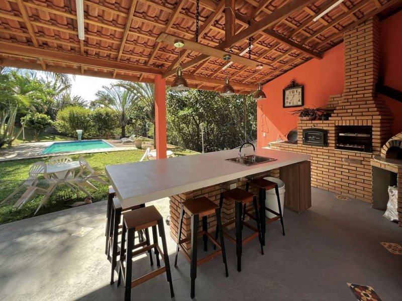 lenha, forno de pizza, ilha com pia inox e grande balcão.