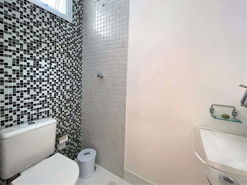 - Banheiros com tampos em mármore, espelho, gabinetes, box de vidro e nichos.