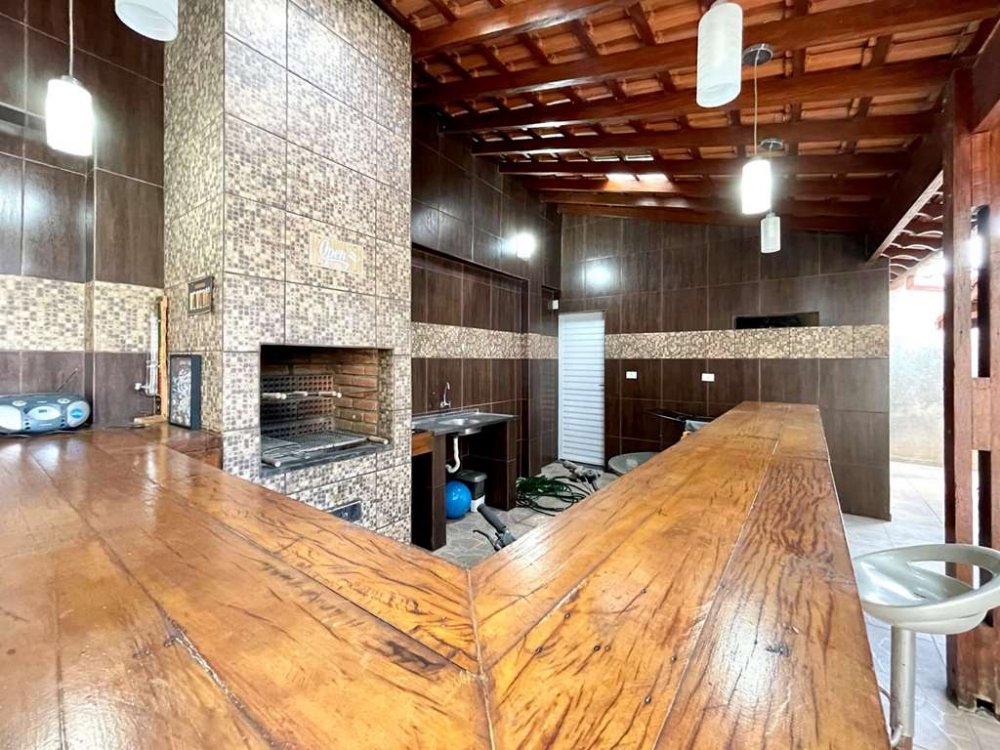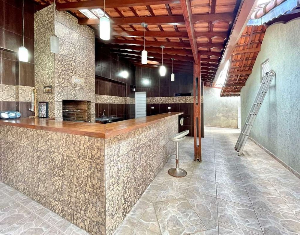 • Edícula gourmet com churrasqueira, bancada, pia, fogão 2 bocas e grande balcão em L com tampo de madeira.