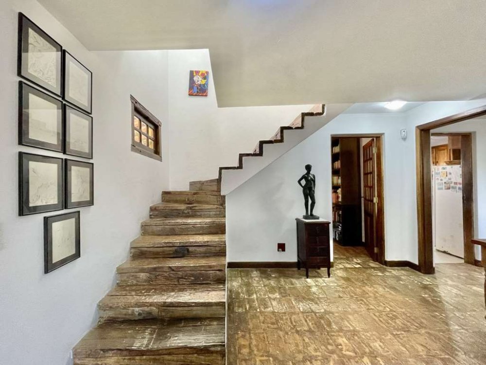 - Escada de alvenaria, revestida em madeira rústica.