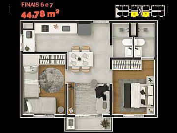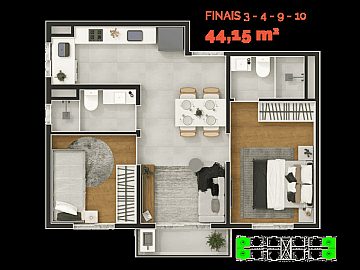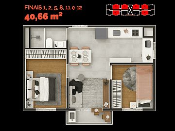 Metragens: Unidades que variam de aproximadamente 40 m² a 45 m².