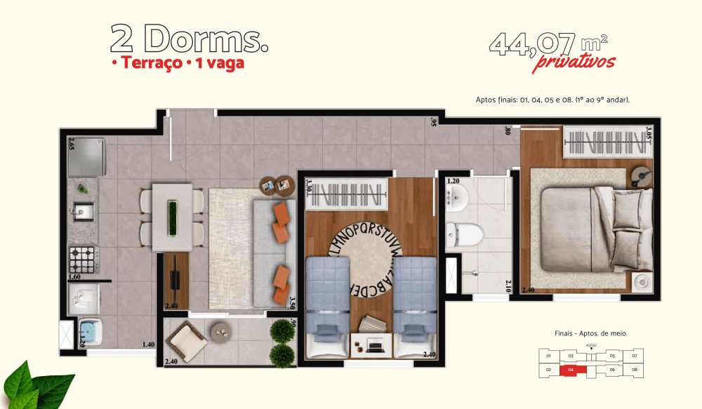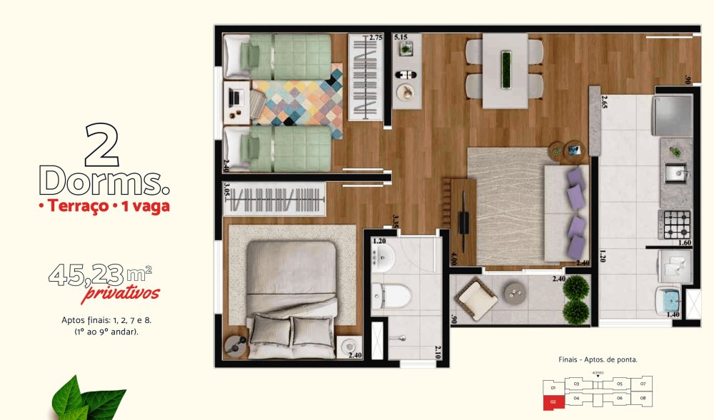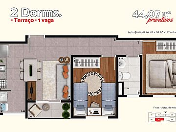 Plantas: Opções de 44,07 m² ou 45,23 m², ambas com: